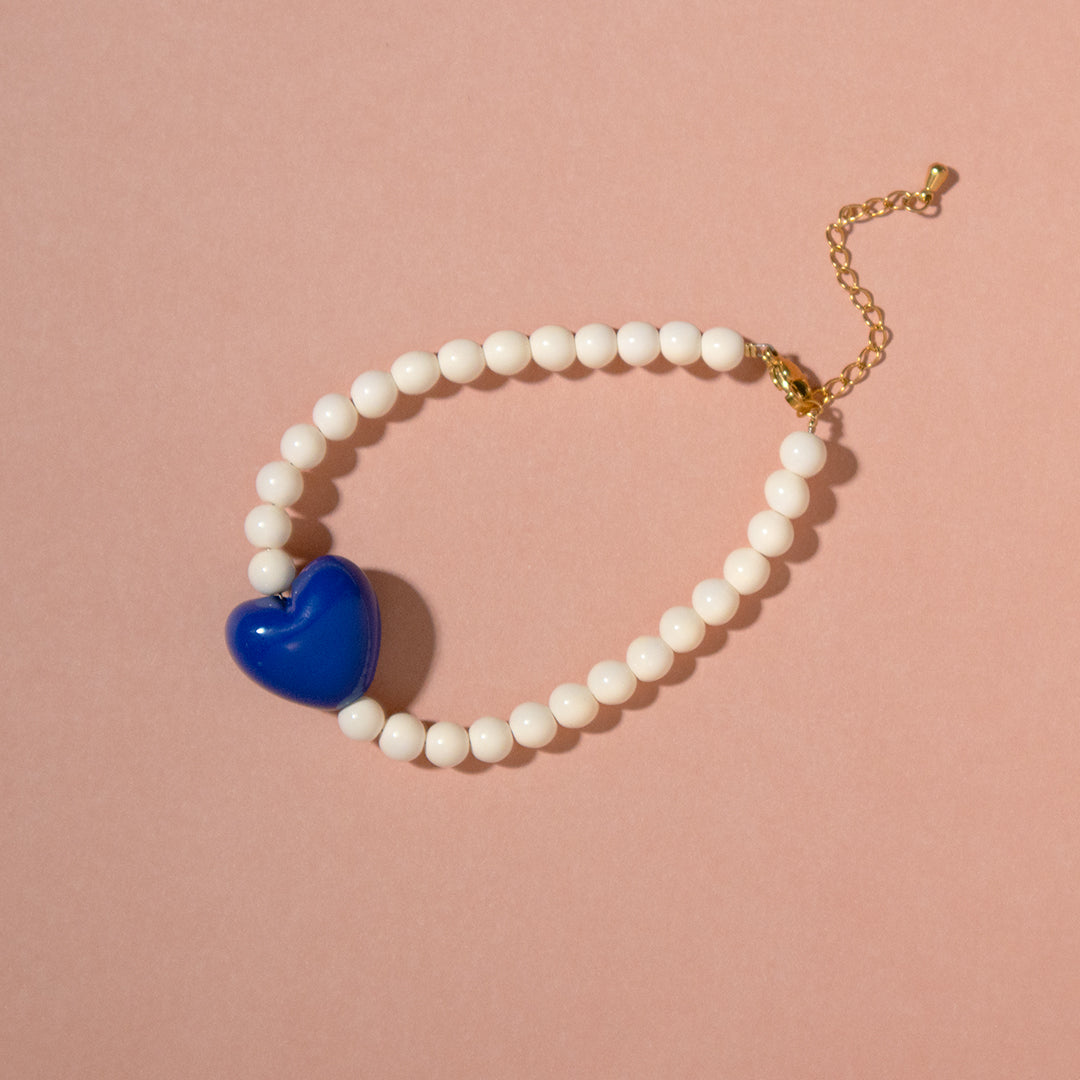 This bracelet pairs glossy cream glass beads with a vibrant blue heart for a playful finish.