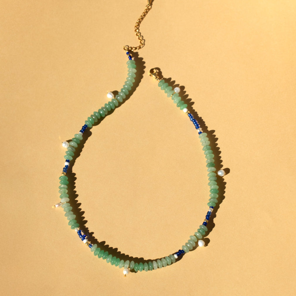 Semi-precious green stones are paired with luminous pearls and contrasting seed beads for a look that feels both playful and polished. With its mix of organic shapes and bold tones, this piece brings an easy, artisanal edge to your jewellery lineup.