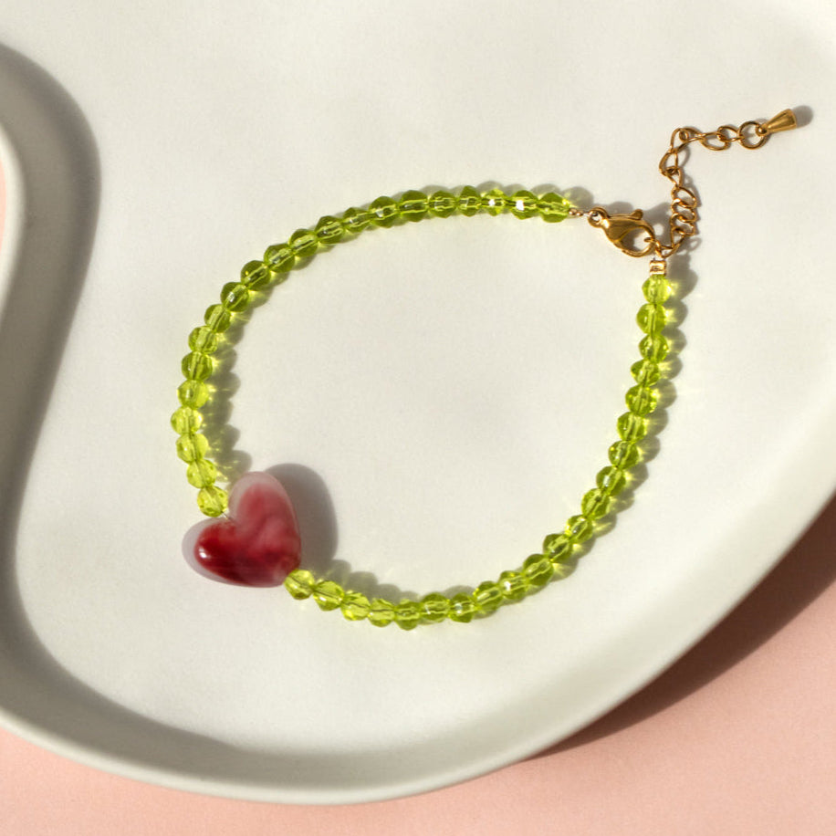 The Pistachio and Raspberry Heart Gelato Bracelet brings soft colour, shine, and a little sweetness to your wrist.